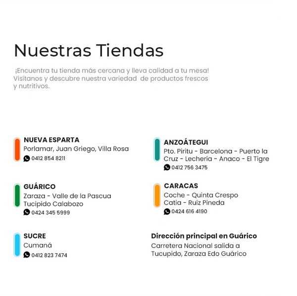 Desde 2000, hemos crecido con un solo propósito: ofrecer lo mejor del campo venezolano a cada hogar. Con más de 20 tiendas a nivel nacional y un equipo dedicado, seguimos llevando sabor y nutrición a tu vida.